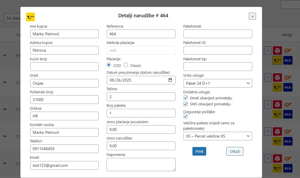 - Kod narudžbe za koju želite generirati adresnicu kliknite na žutu ikonu s logotipom Hrvatske pošte