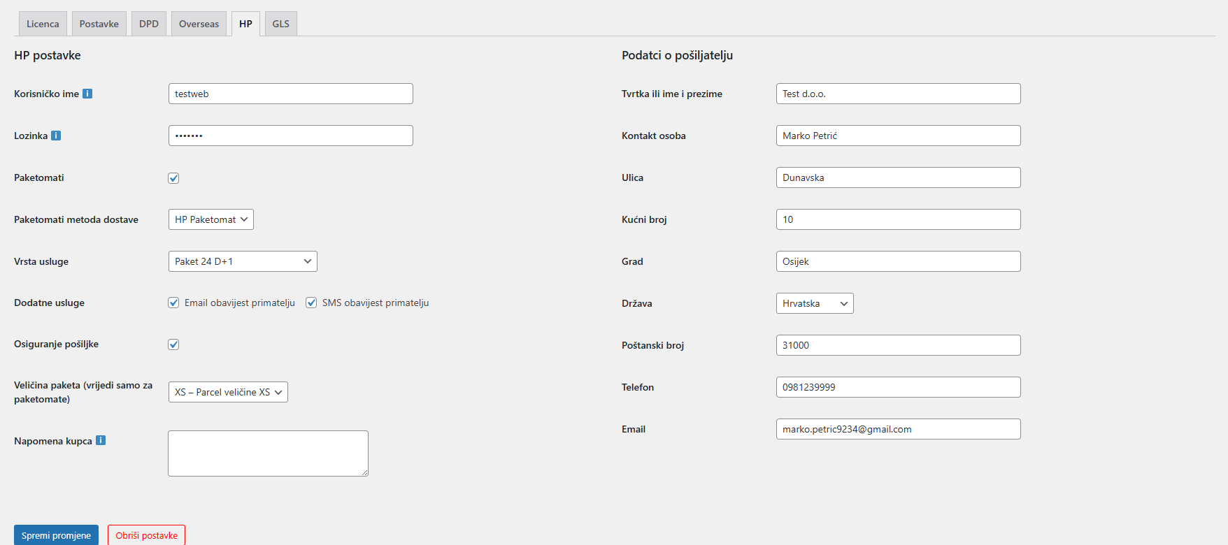 Prije korištenja funkcije generiranja adresnica, potrebno je u postavkama plugina (tab HP) unijeti korisničko ime i lozinku koje ste dobili od Hrvatske pošte (HP administracija), te obavezno unijeti podatke o pošiljatelju kako bi se adresnice mogle ispravno generirati.