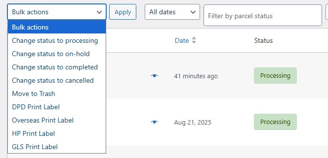 Statuses appear next to orders for which labels have been generated, and they change depending on the updates DPD sends from their system.