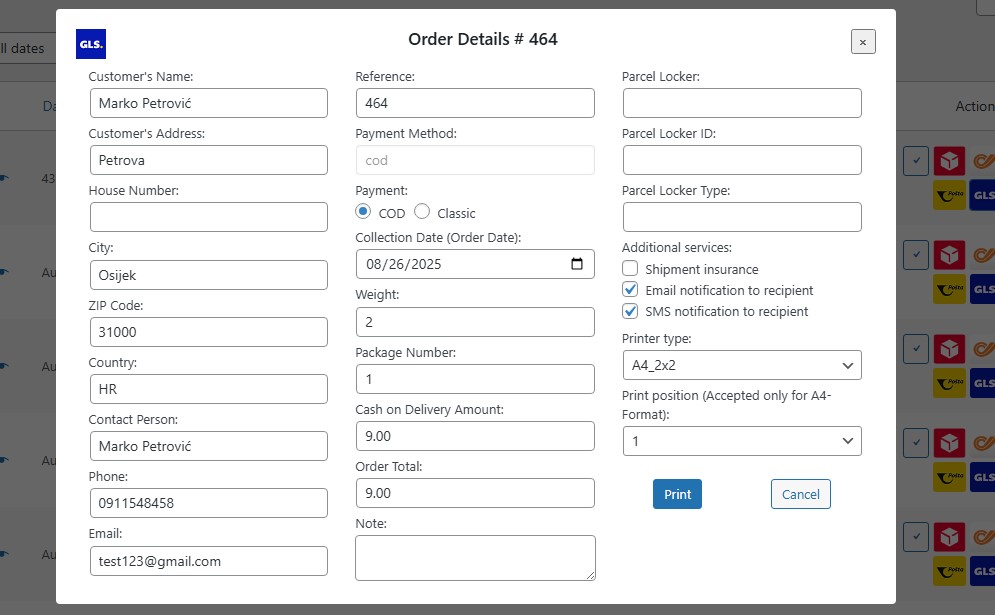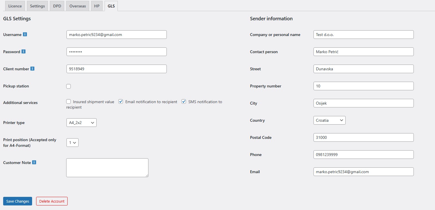 Before using the label generation feature, you need to enter the username, password, and client number you received from GLS (GLS administration) in the plugin settings (GLS tab), and make sure to enter the sender details so labels can be generated correctly.